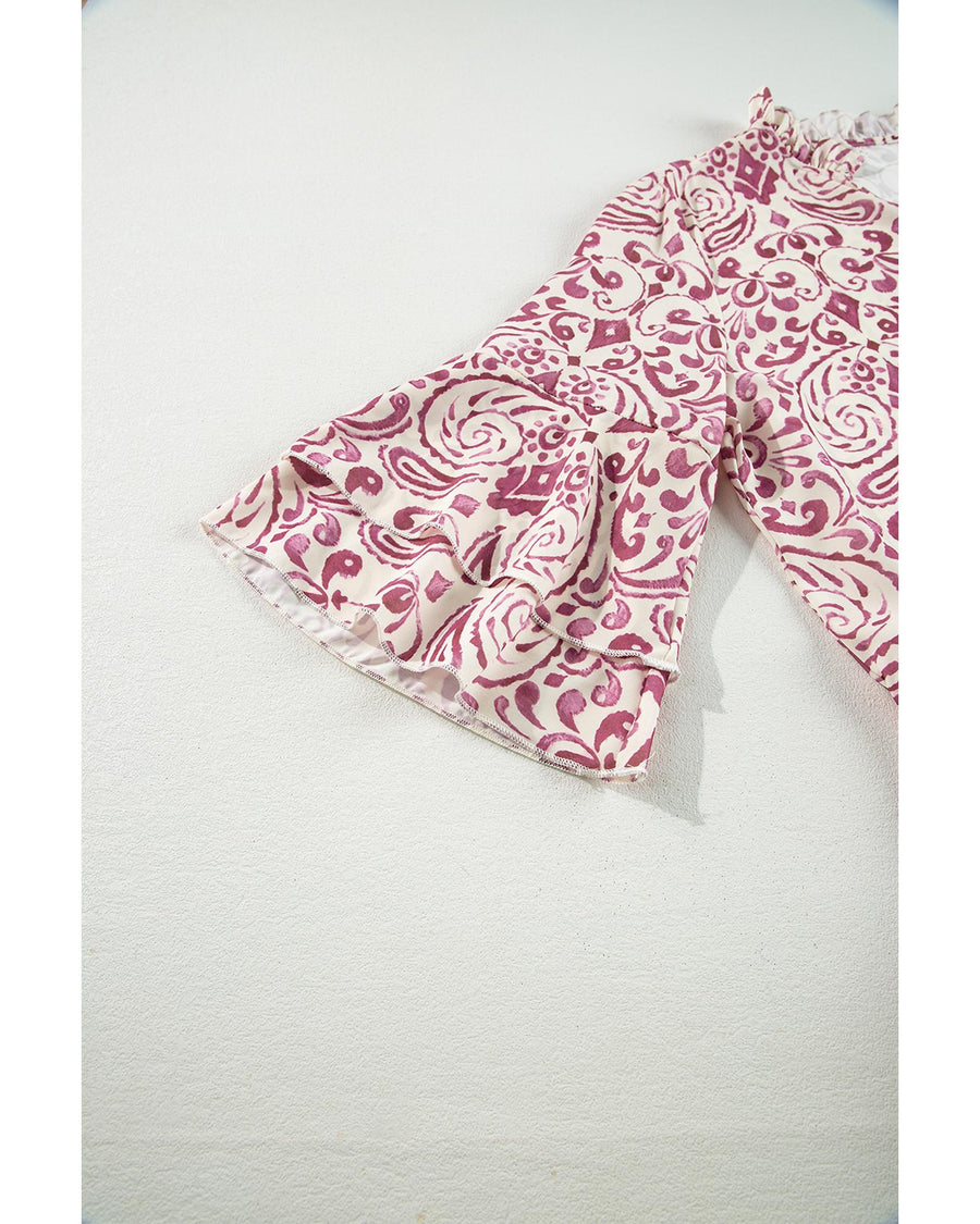 Pink Paisley Print Tiered 3/4 Sleeve Notched Neck Mini Dress - S