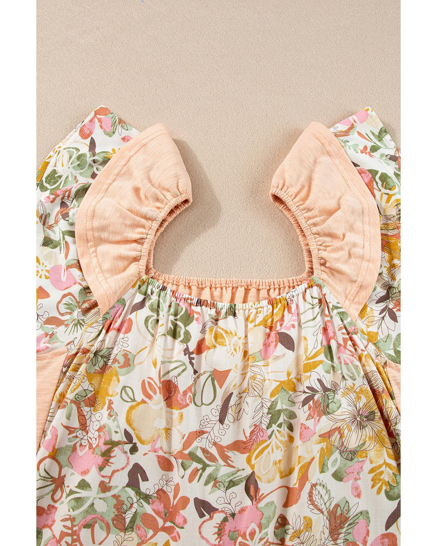 Apricot Pink Floral Patchwork Square Neck Ruffle Sleeve Blouse - M
