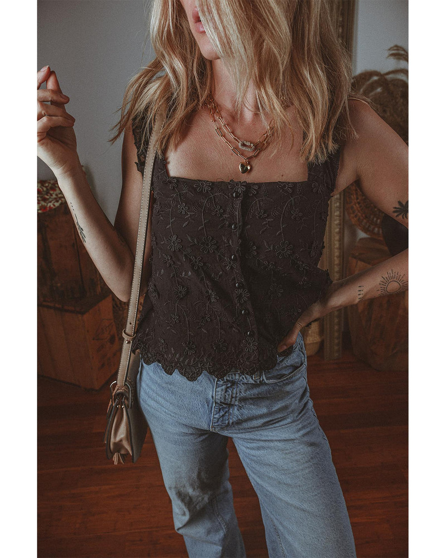 Black Floral Embroidered Buttoned Square Neck Tank Top - L