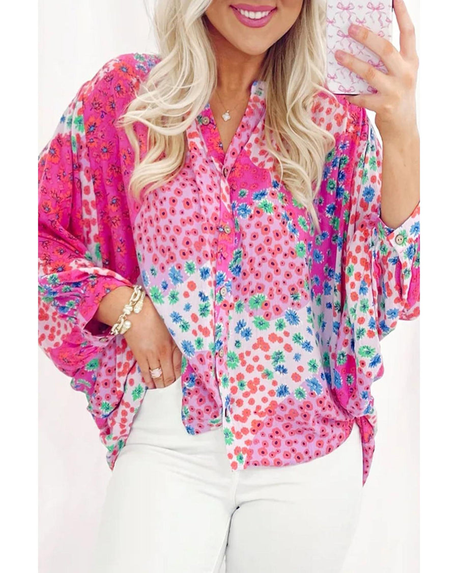 Rose Red Floral Allover Print Buttoned V Neck Oversized Shirt - M