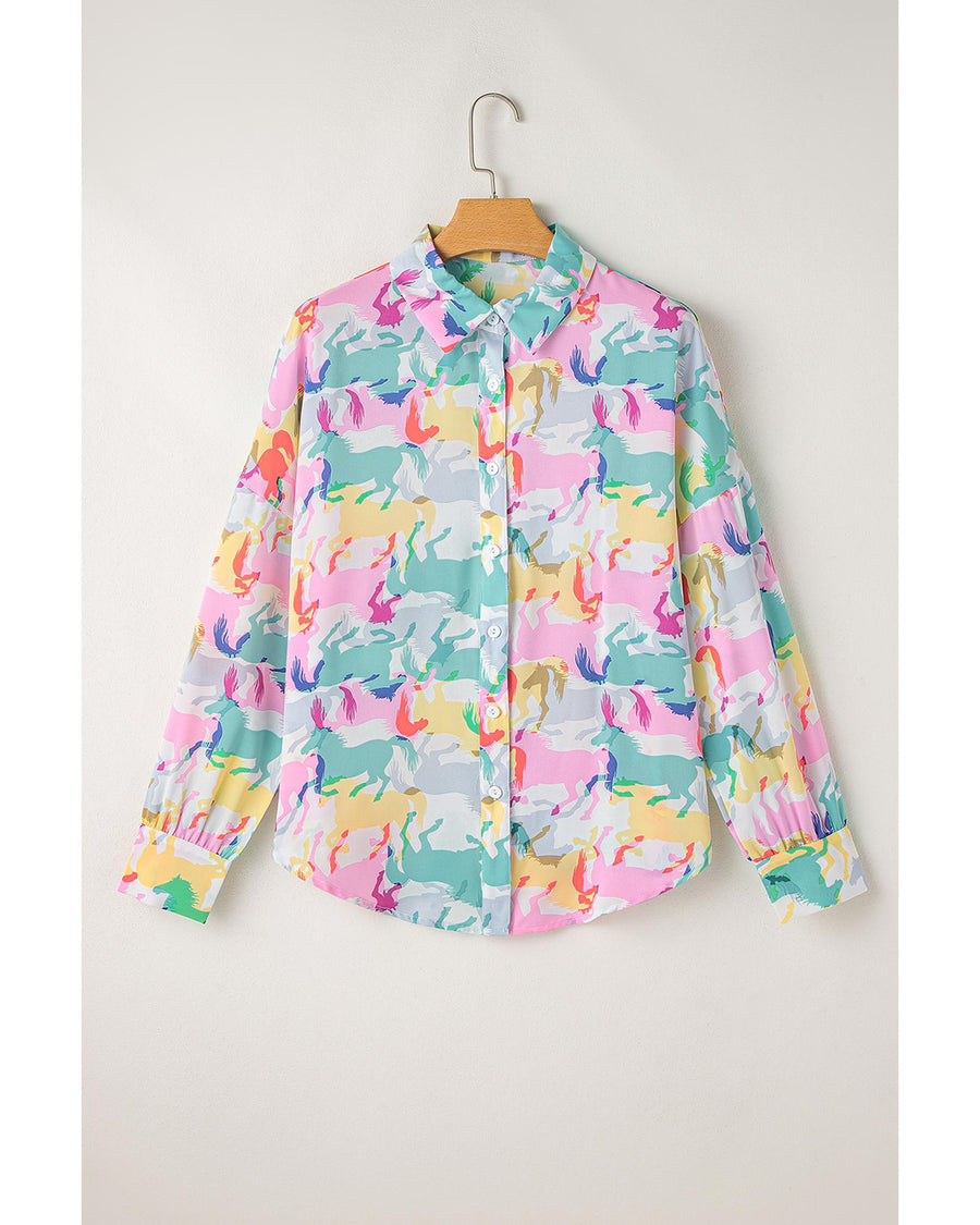 White Colorful Horse Printed Long Sleeve Button Up Casual Shirt - L