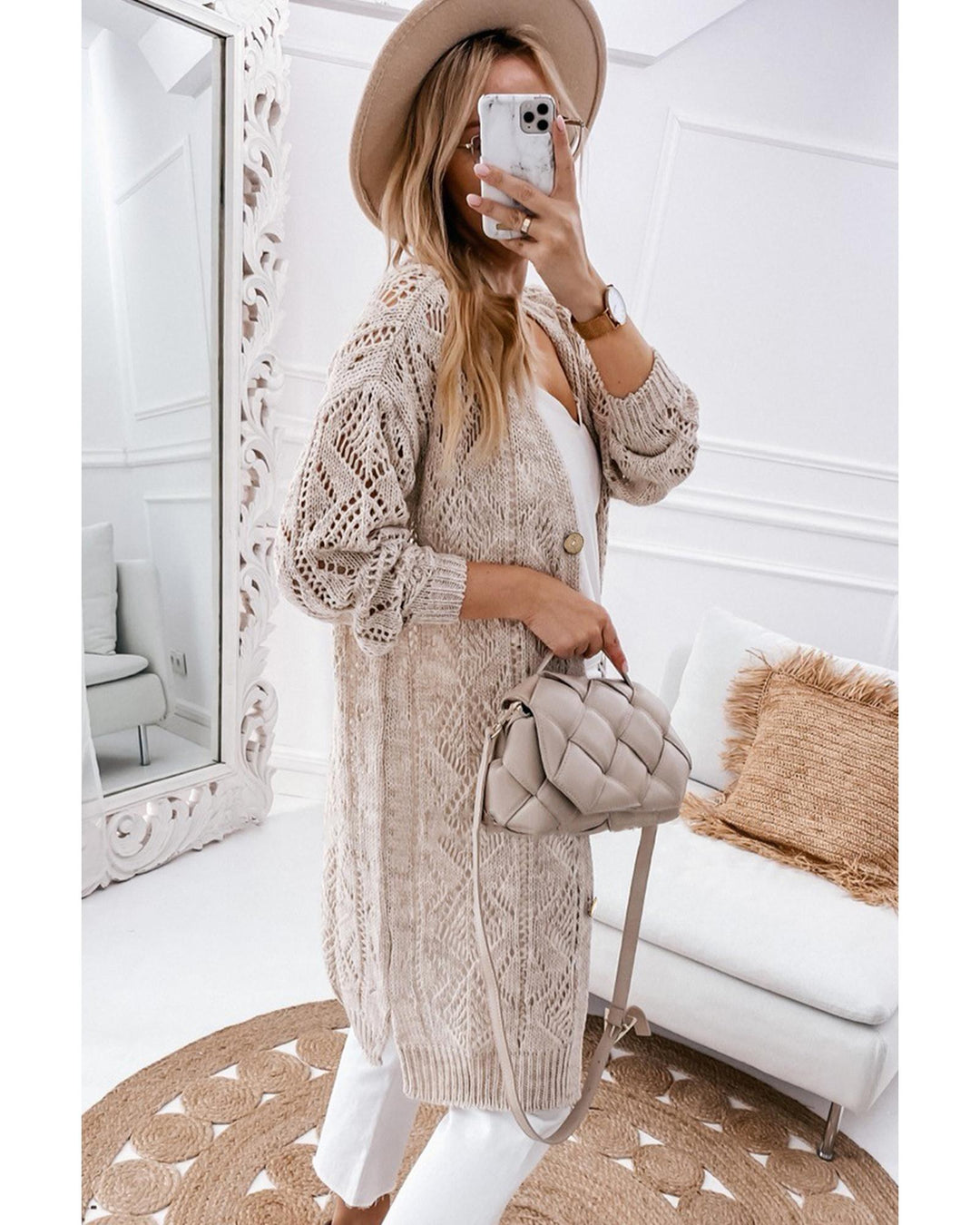 Discover the perfect blend of style and comfort with our elegantly designed knit cardigan, featuring a flattering drape and intricate openwork pattern that adds a touch of sophistication to any outfit. The buttoned front ensures easy wear, while the high-quality fabric, made from 60% cotton and 40% acrylic, provides warmth without added weight, making it ideal for layering during transitional seasons. Whether you're dressing up for a formal occasion or keeping it casual, this versatile cardigan is a must-have addition to your wardrobe. Shipped directly from overseas, it combines practicality and trendiness seamlessly.