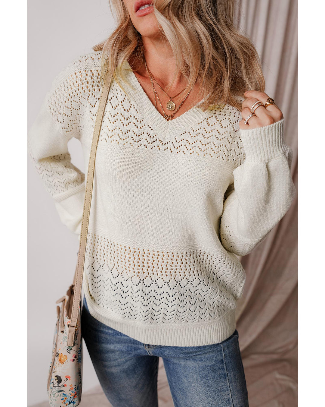 White Eyelet Pattern Detail V Neck Drop Shoulder Sweater - L