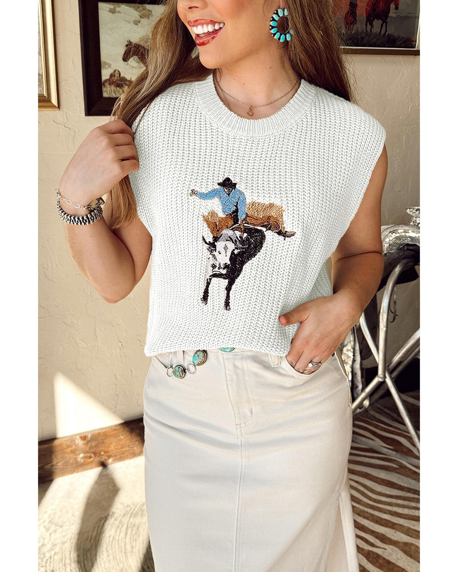 White Western Cowboy Embroidery Round Neck Sleeveless Sweater - L