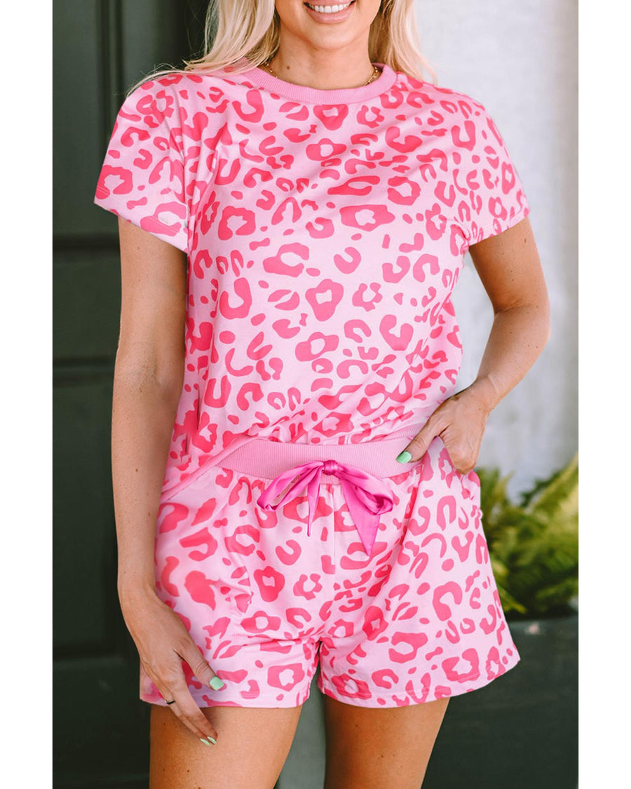 Pink Leopard Print Tee and Satin Tie Shorts Lounge Set - M