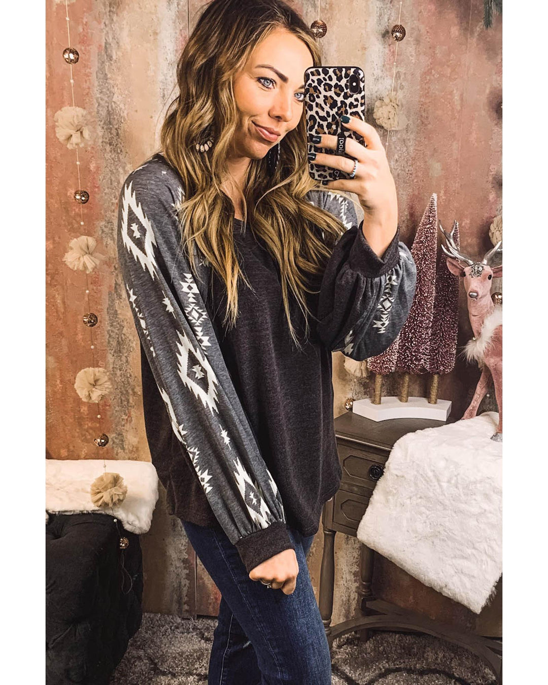 Black Western Print Patch Long Sleeve Top - S