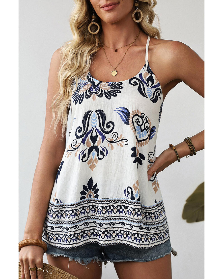 Blue Bohemian Fashion Print Spaghetti Straps Loose Tank - S